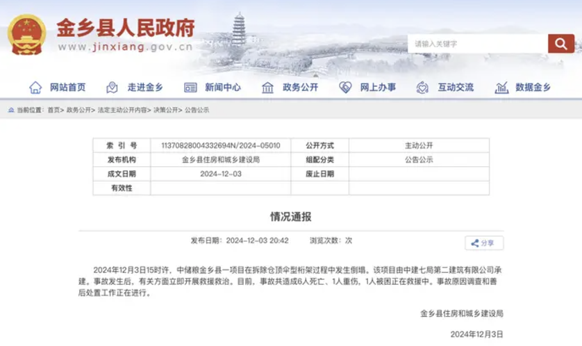 山东济宁金乡县住房和城乡建设局通报,12月3日15时许,中储粮金乡县一项目在拆除仓顶伞型桁架过程中发生倒塌。该项目由中建七局第二建筑有限公司承建。事故发生后,有关方面立即开展救援救治。目前,事故共造成6人死亡、1人重伤,1人被困正在救援中。事故原因调查和善后处置工作正在进行。