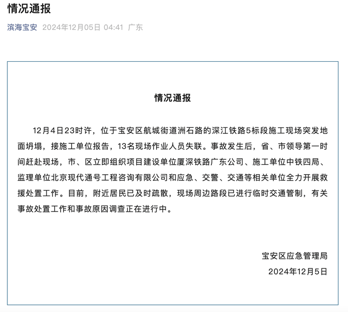 据界面,深圳市宝安区应急管理局12月5日通报,12月4日23时许,位于宝安区航城街道洲石路的深江铁路5标段施工现场突发地面坍塌,接施工单位报告,13名现场作业人员失联。事故发生后,省、市领导第一时间赶赴现场,市、区立即组织项目建设单位厦深铁路广东公司、施工单位中铁四局、监理单位北京现代通号工程咨询有限公司和应急、交警、交通等相关单位全力开展救援处置工作。目前,附近居民已及时疏散,现场周边路段已进行临时交通管制,有关事故处置工作和事故原因调查正在进行中。