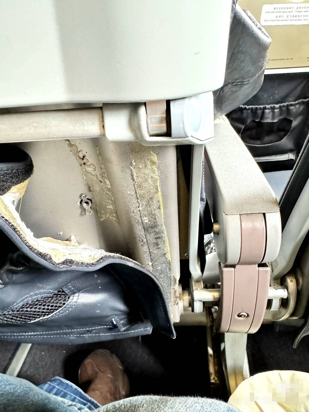 据网友发布的图片显示,她所在座位旁的舷窗四周都贴上了胶带,而座位前方的置物篮右侧脱线后垂挂着一大截。