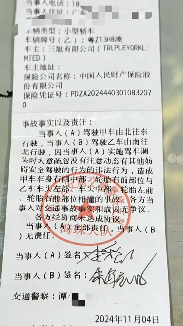 劳斯莱斯车主还在视频中晒出了交警给出的交通事故责任认定书,部分内容显示:当事人(A)实施驾车掉头时疏忽大意没有注意动态有其他妨碍安全驾驶的行为的违法行为,造成甲车和乙车受损。