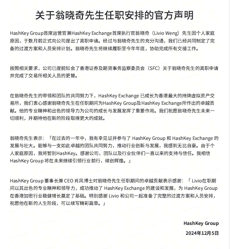 据界面新闻,12月5日,总部位于香港的虚拟资产集团HashKey发布声明称,HashKey Group首席运营官兼HashKey Exchange首席执行官翁晓奇(Livio Weng)因个人家庭原因,于数月前正式向公司提出了离职申请。翁晓奇将继续履职至今年年底,协助完成所有交接工作。