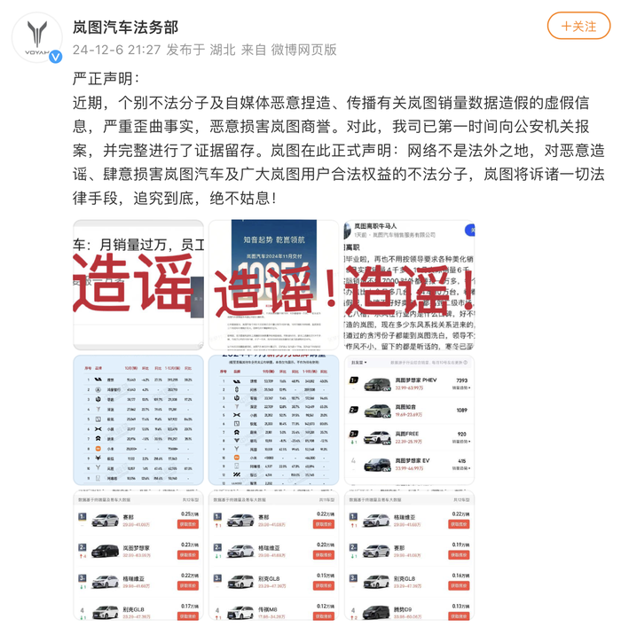 12月6日,岚图汽车法务部发布声明称,近期,个别不法分子及自媒体恶意捏造、传播有关岚图销量数据造假的虚假信息,严重歪曲事实,恶意损害岚图商誉。对此,公司已第一时间向公安机关报案,并完整进行了证据留存。