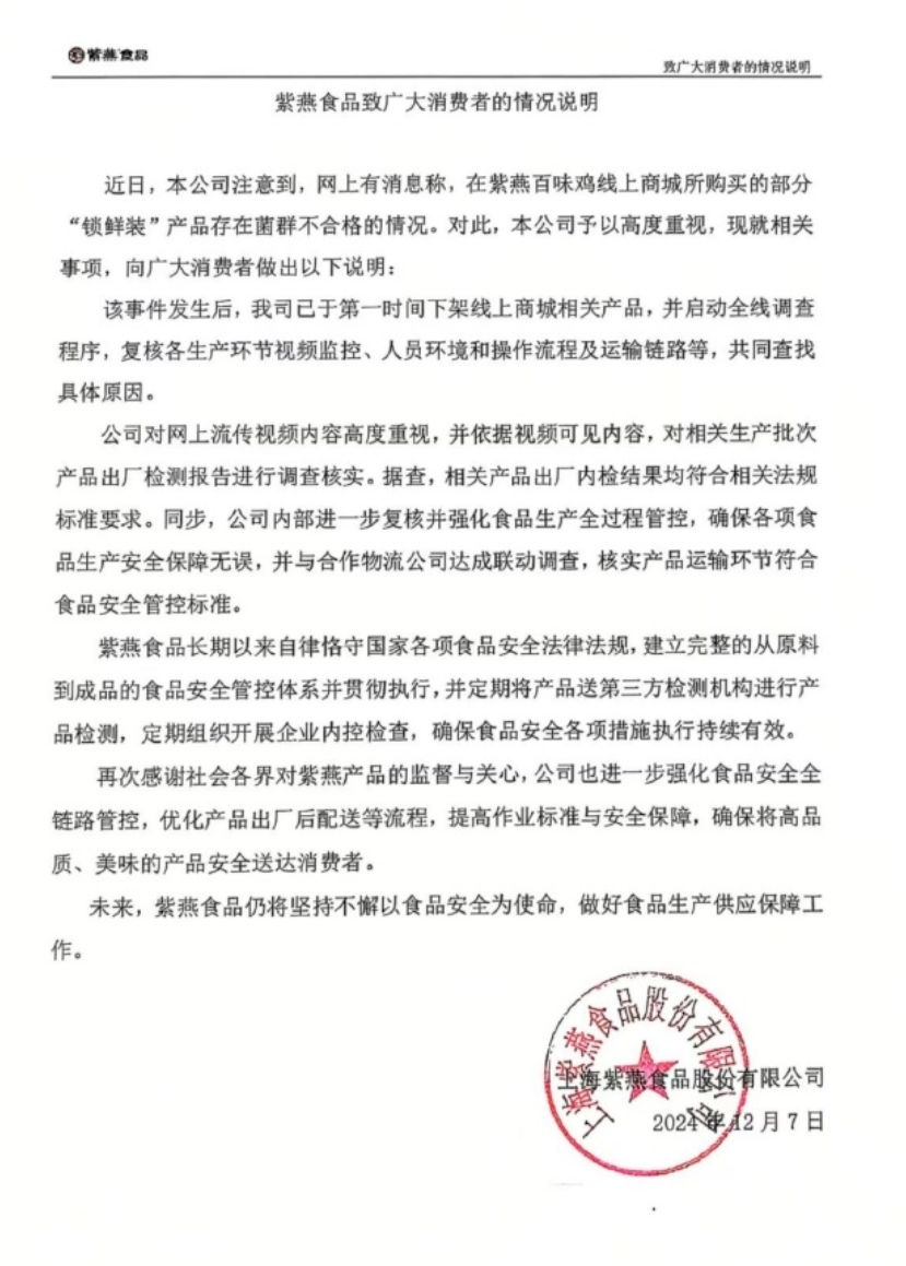 据大河财立方,2月7日,针对在紫燕百味鸡线上商城所购买的部分“锁鲜装”产品存在菌群不合格这一情况,紫燕食品发布今日说明。
