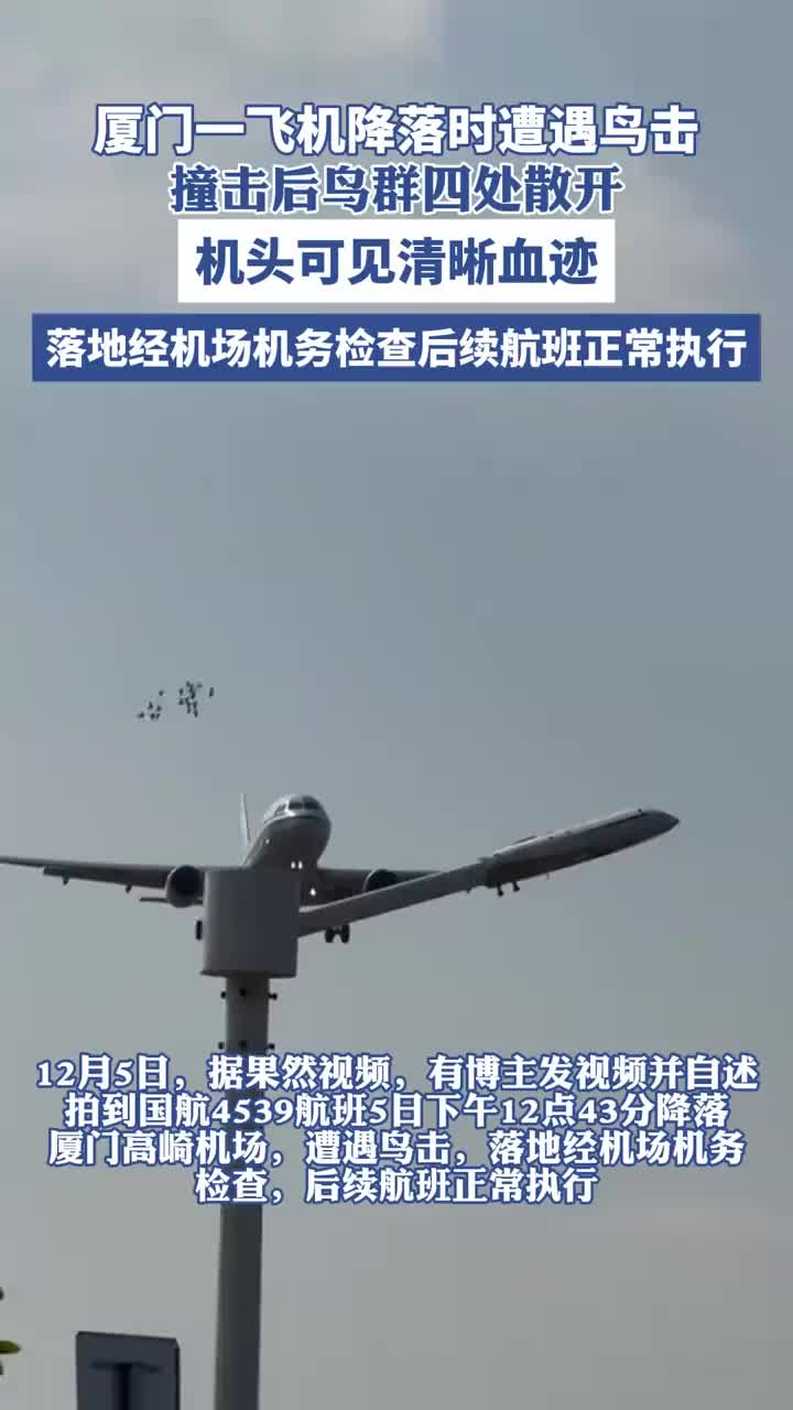 12月5日,厦门一飞机降落时撞到鸟群,撞击后鸟群四处散开,机头可见清晰血迹,落地经机场机务检查后续航班正常执飞。(via 映象网)