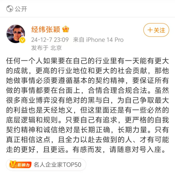 经纬中国创始管理合伙人张颖疑就月之暗面纠纷事件发表观点。12月7日,张颖发布微博表示,“任何一个人如果要在自己的行业里有一天能有更大的成就,更高的行业地位和更大的社会贡献,那他她做事情必须要遵循基本的契约精神,要保证所有做的事情都要在台面上,合情合理合规合法。虽然很多商业博弈没有绝对的黑与白,为自己争取最大的利益也是天经地义,但这里面还是有一些必然的底层逻辑和规则。只要自己有追求,更严格的自我契约精神和诚信绝对是长期正确,长期力量。只有真正相信这点,且全力以赴去做到的人、才有可能走的更好,且更远。”他还回复“捞一票大的就够了”的说法称,通常这么想的,99.9%最后发现啥都没捞到。