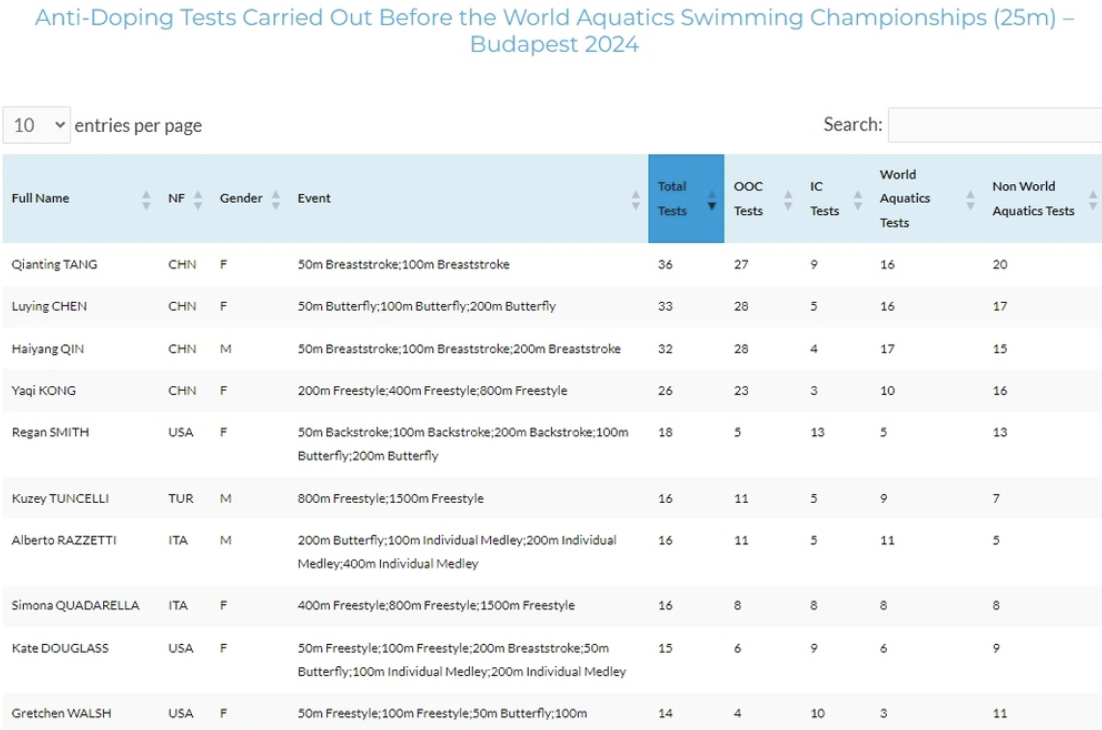 参赛选手平均检测次数方面,中国游泳队同样最多。中国选手人均接受了9.4次检测,排名所有参赛队伍首位。值得注意的是,美国选手大部分检测均不是由世界泳联组织进行的,而是由美国反兴奋剂机构(USADA)组织进行。
