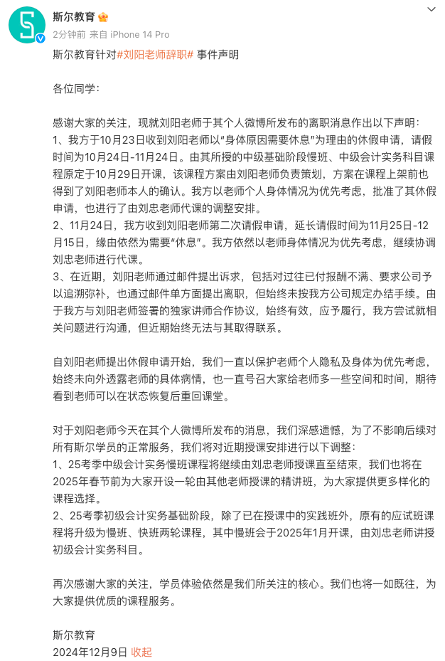 斯尔教育回应刘阳辞职:深感遗憾,将调整近期授课安排。
