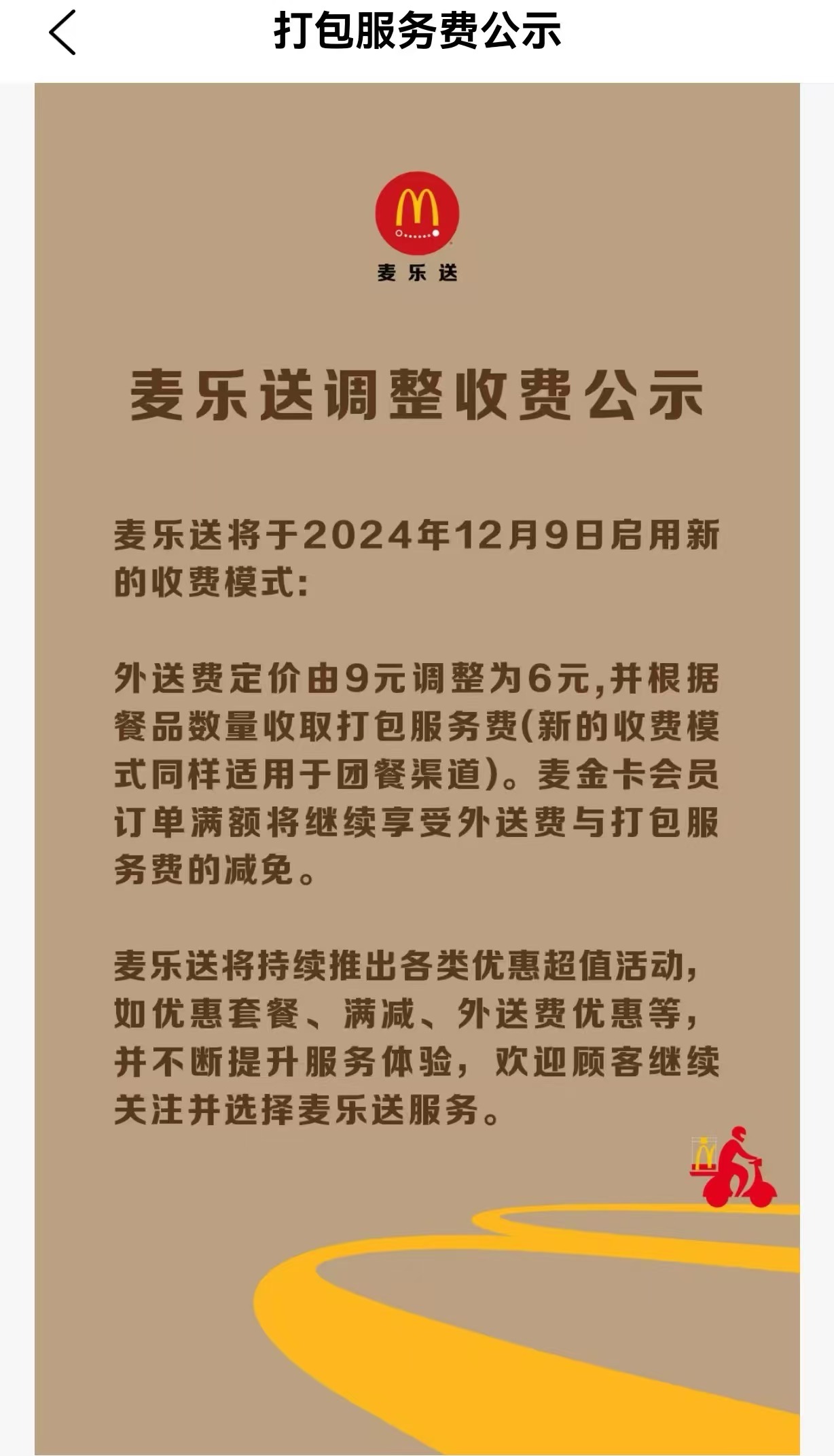 近日,麦当劳发布关于麦乐送调整收费公示的公告,称麦乐送将于2024年12月9日启用新的收费模式,外送费定价由9元调整为6元,并根据餐品数量收取打包服务费(新的收费模式同样适用于团餐渠道)。麦金卡会员订单满额将继续享受外送费与打包服务费的减免。