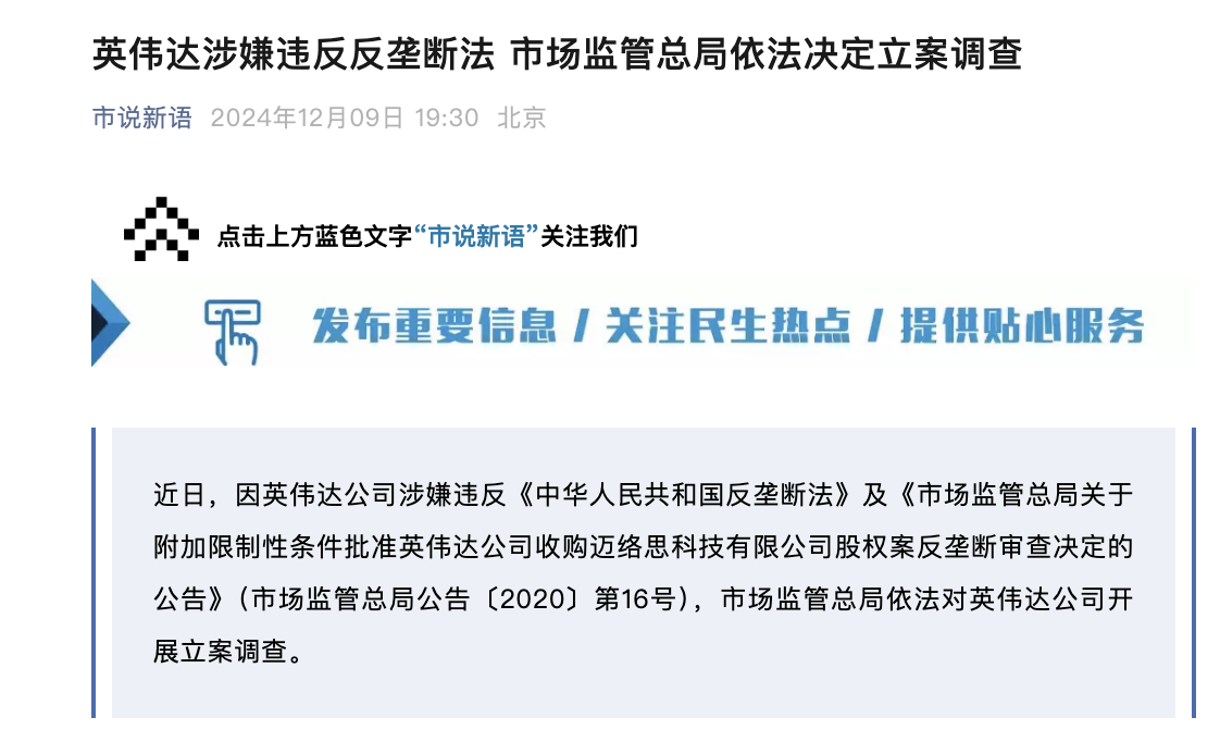 英伟达涉嫌违反反垄断法,市场监管总局依法决定立案调查。