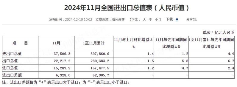 据财联社,海关总署12月10日发布数据显示,中国11月出口(以人民币计价)同比增5.8%,前值增11.2%;进口降4.7%,前值降3.7%;贸易顺差6928亿元,前值6791亿元。中国11月出口(以美元计价)同比增长6.7%,前值增12.7%;进口下降3.9%,前值下降2.3%;贸易顺差974.4亿美元,前值957.2亿美元。