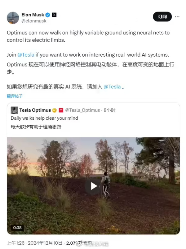 马斯克展示机器人征服崎岖地形,不依赖视觉系统。