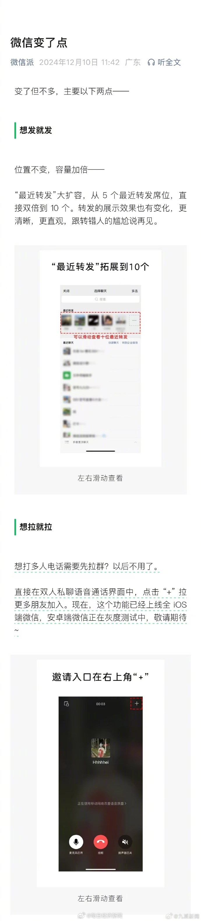据每日经济新闻,12月10日,“微信派”官方公众号宣布微信两项新变化。首先是“最近转发”大扩容,从5个最近转发席位,直接双倍到10个。转发的展示效果也有变化,更清晰,更直观,跟转错人的尴尬说再见。想打多人电话也不用先拉群了,直接在双人私聊语音通话界面中,点击“+”拉更多朋友加入。现在,这个功能已经上线全iOS端微信,安卓端微信正在灰度测试中。