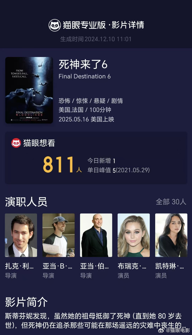 著名恐怖片系列新作《死神来了6》北美定档明年5月16日。