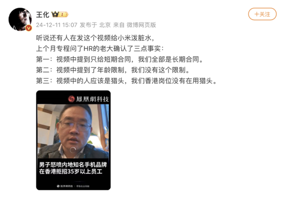 据界面,近日,有网友在社交平台发视频称,某内地手机品牌在香港拒招35岁以上员工,引发热议。对此,12月11日,小米公关部总经理王化发文辟谣,称公司招聘“没有这个限制”。
