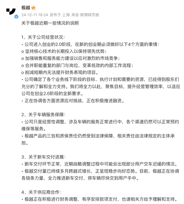 极越汽车官方12月11日发布《关于极越近期一些情况的说明》,就该公司经营状况、车辆服务保障、新车交付进展、供应商合作进行说明。