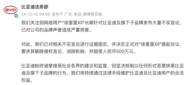 12月12日,比亚迪法务部发布声明称,关注到网络用户“徐里里Xll”长期针对比亚迪及旗下子品牌发布大量不实言论,已对公司的品牌声誉造成严重损害。对此,公司已对相关不实言论进行证据固定,并决定正式对“徐里里Xll”提起诉讼,要求其删除侵权言论、消除影响,并赔偿人民币500万元。