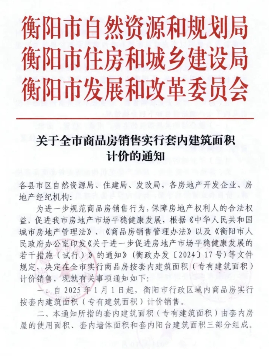 据界面,衡阳市自然资源和规划局、衡阳市住房和城乡建设局、衡阳市发展和改革委员会联合发布《关于全市商品房销售实行套内建筑面积计价的通知》,2025年1月1日起,湖南省衡阳市商品房销售实行套内建筑面积计价。套内建筑面积(专有建筑面积)由套内房屋的使用面积、套内墙体面积和套内阳台建筑面积三部分组成。房地产开发企业在签订商品房网签合同时,应与购房人约定按套内建筑面积(专有建筑面积)计算商品房价款,面积纠纷条款应当载明以套内建筑面积和套内建筑面积价格作为处理面积纠纷的计价依据。