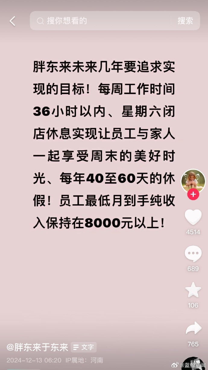 据蓝鲸新闻,12月13日,于东来发文称,胖东来未来几年要追求实现的目标!每周工作时间36小时以内、星期六闭店休息实现让员工与家人一起享受周末的美好时光、每年40至60天的休假!员工最低月到手纯收入保持在8000元以上!