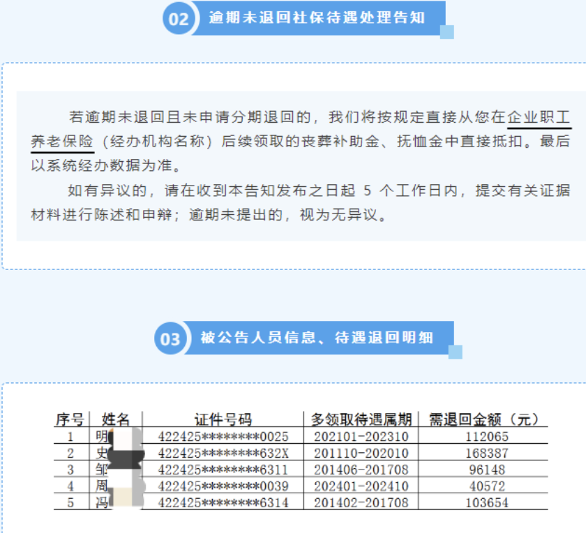 监利市企业养老保险服务中心工作人员对记者表示,此次批量公告5人多领取养老保险待遇,其实是指在他们本人去世后,其养老保险待遇仍被领取。