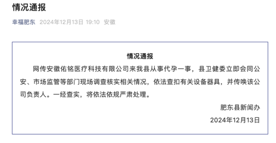 12月13日,肥东县新闻办发布情况通报:网传安徽佑铭医疗科技有限公司来我县从事代孕一事,县卫健委立即会同公安、市场监管等部门现场调查核实相关情况,依法查扣有关设备器具,并传唤该公司负责人。一经查实,将依法依规严肃处理。