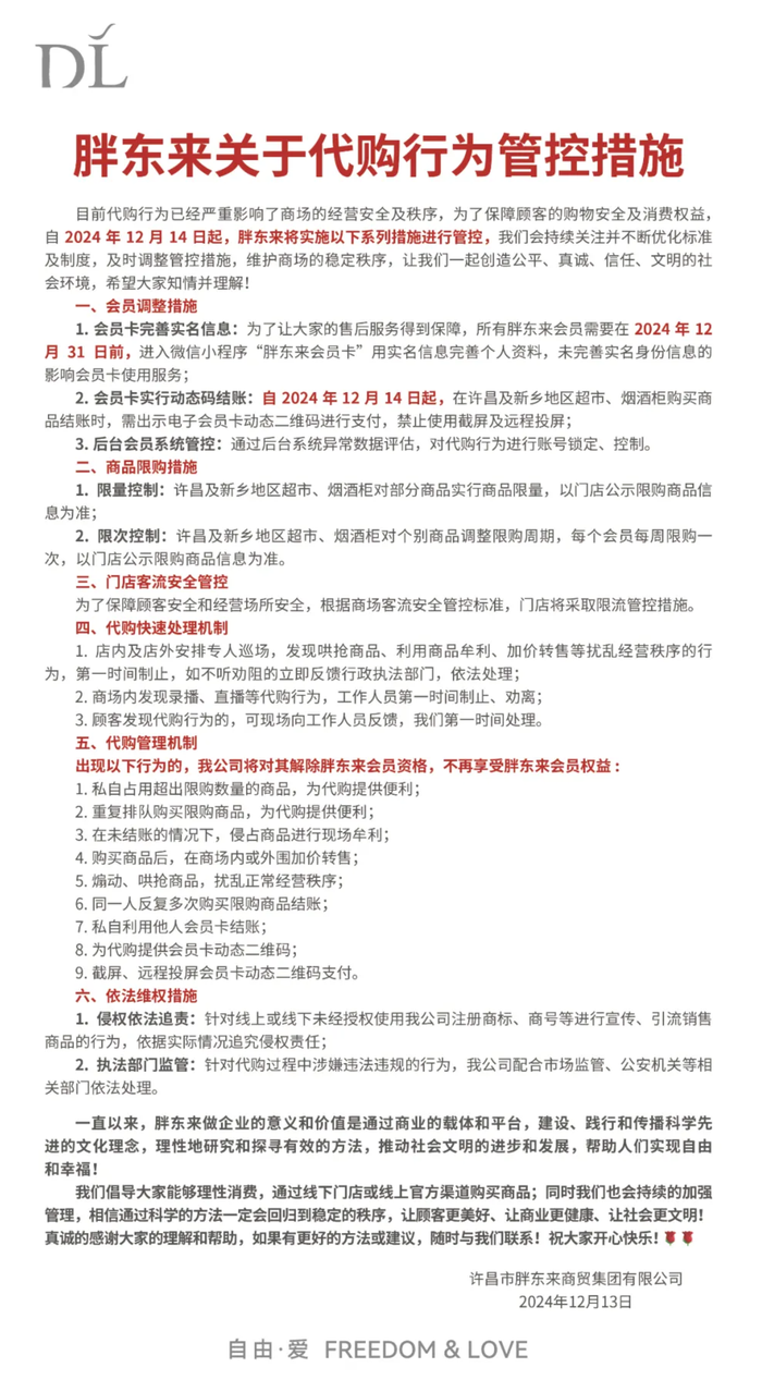 据界面,胖东来12月14日发布公告称,由于目前代购行为严重影响商场经营安全及秩序,自即日起将实施代购行为管控措施,包括会员需完善会员卡实名信息和实行动态码结账,许昌及新乡地区超市、烟酒柜对部分商品实行商品限量,对个别商品调整限购周期,每个会员每周限购一次,以门店公示限购商品信息为准。