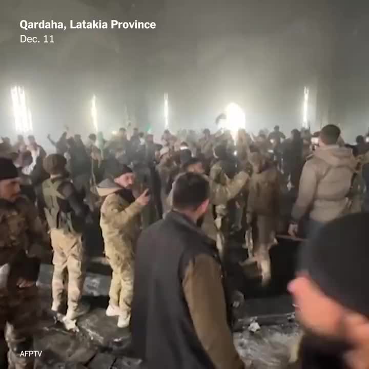 当地时间12月11日,在阿萨德家族的家乡卡尔达哈,数名身着迷彩服的叙利亚反对派士兵,聚集在一个正在燃烧的棺材的周围。