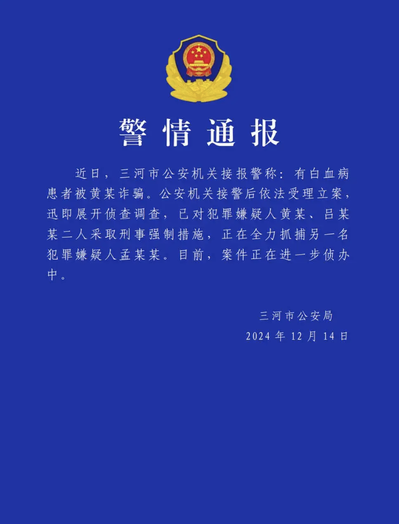 河北三河警方通报“白血病患者被诈骗”:对两人采取刑事强制措施,全力抓捕另一嫌犯。