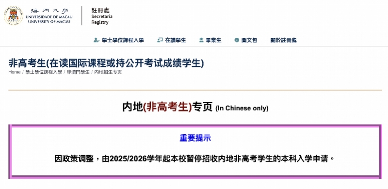 据南方都市报,近期,香港高校假学历风波持续发酵,影响范围已蔓延至澳门。12月15日,南都记者注意到,澳门大学官网内地招生专页发布重要提示称,因政策调整,由2025/26学年起,该校暂停招收内地非高考学生的本科入学申请。南都此前报道,10月底,经香港考评局核查文凭试(DSE)成绩,24名已成功入读澳门科技大学的内地学生被发现使用虚假资料报读入学,被校方撤销学籍。