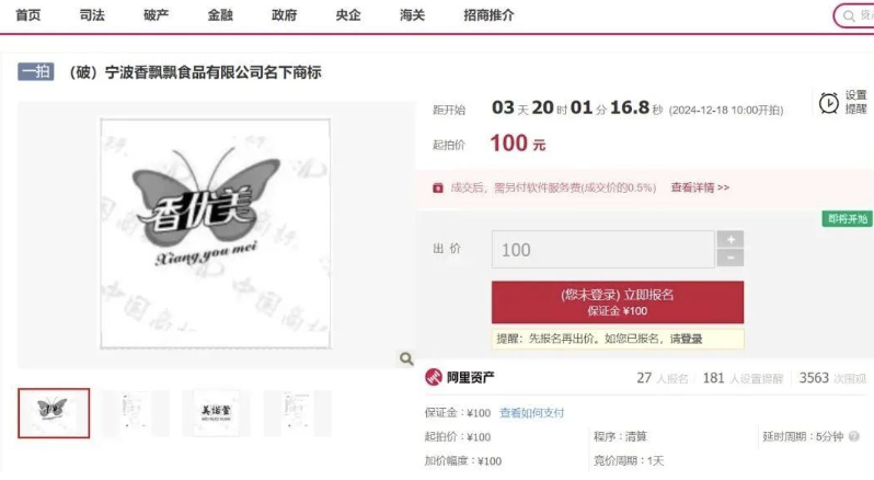 据潮新闻12月16日消息,12月18日,宁波香飘飘食品有限公司名下2个注册商标“香优美”“美诺萱”将被破产拍卖,起拍价仅为100元。