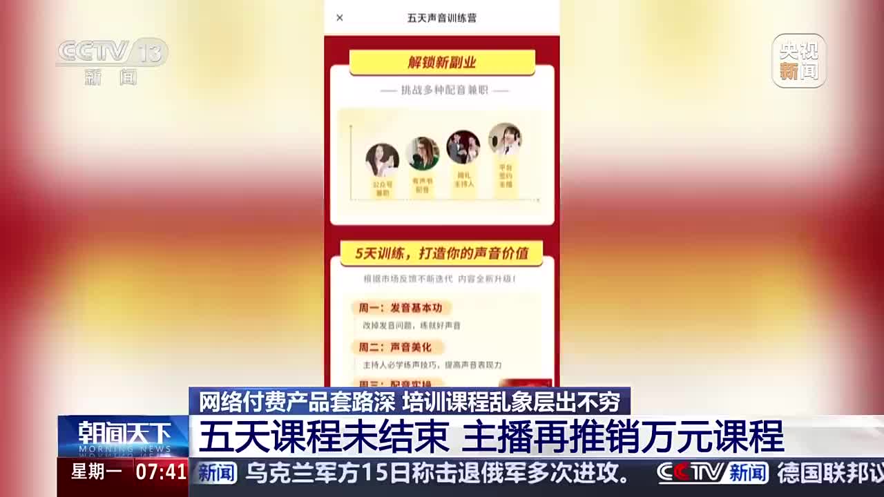 总台记者调查发现,不少直播间在推销低价网课,有的仅需1.9元。记者发现,1小时的课程实际教学内容不足半小时。其它时间老师主要是在展示自己的声音,介绍自己通过声音致富的经历,并声称“可以轻松变现赚钱。”直到直播课程第5天,主播老师就开始宣传14800元的“声音变现实战班”课程,声称现在报名只需要8800元。直播间不断弹出“学位仅剩2个”“学位告急”这样的字眼来营造紧张气氛,消费者在这种气氛下很容易冲动购买。(via 央视新闻)