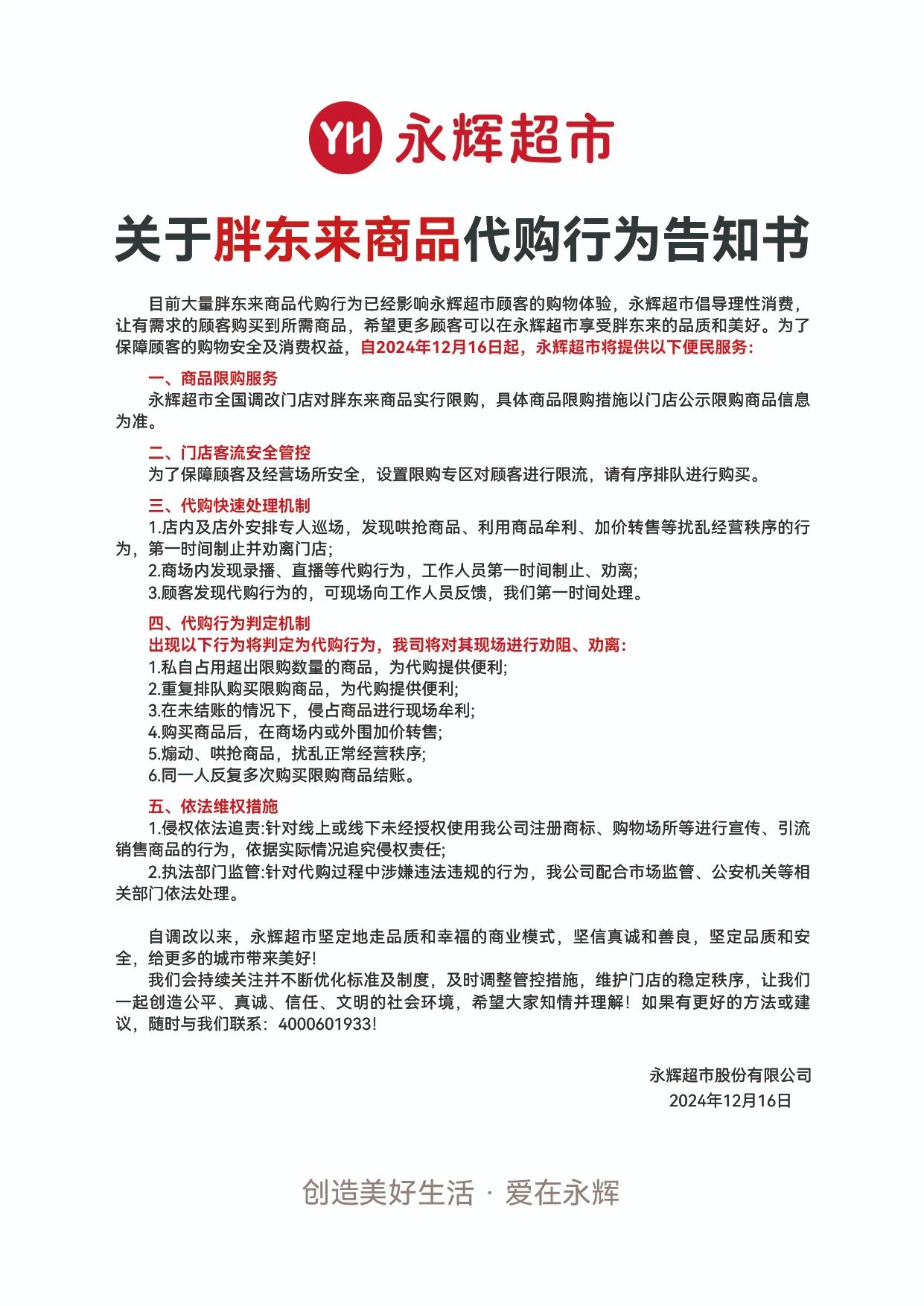 据界面新闻,12月16日,永辉超市股份有限公司发布关于胖东来商品代购行为告知书,称永辉超市全国调改门店对胖东来商品实行限购,具体商品限购措施以门店公示限购商品信息为准。