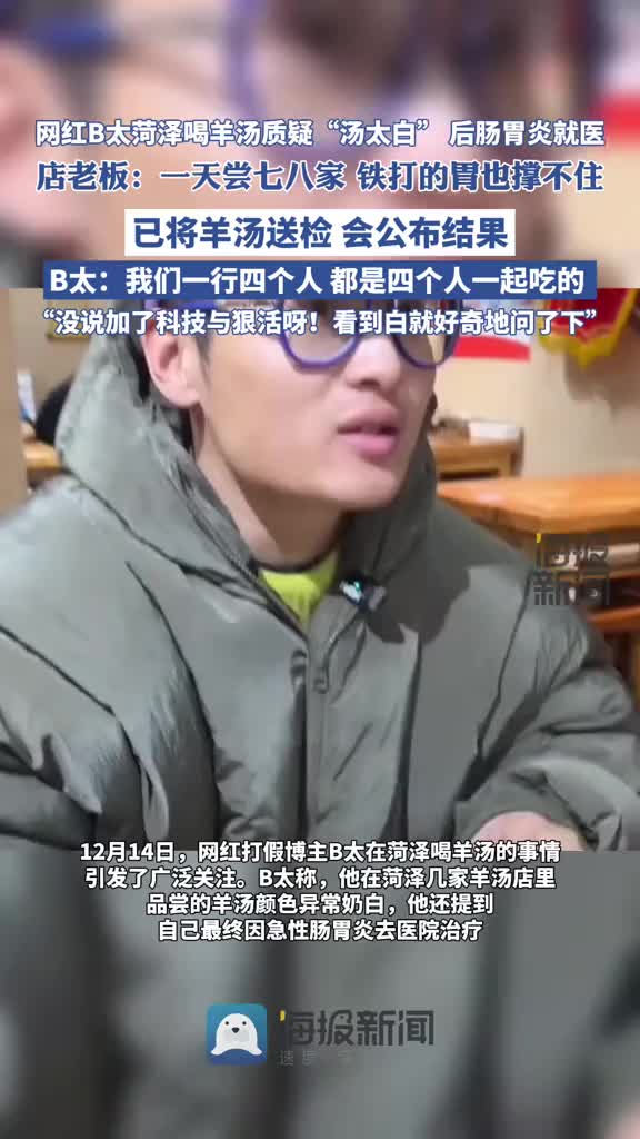 12月16日,据津云消息,B太去的第一家羊汤店的店老板回应了视频中的三点质疑,并称已经将羊汤送去权威机构检测。