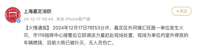 上海嘉定消防通报,12月17日7时53分许,嘉定区外冈镇汇旺路一单位发生火灾,市119指挥中心接警后立即调派力量赶赴现场处置,现场为单位内室外停放的车辆燃烧,目前火势已被扑灭,无人员伤亡。