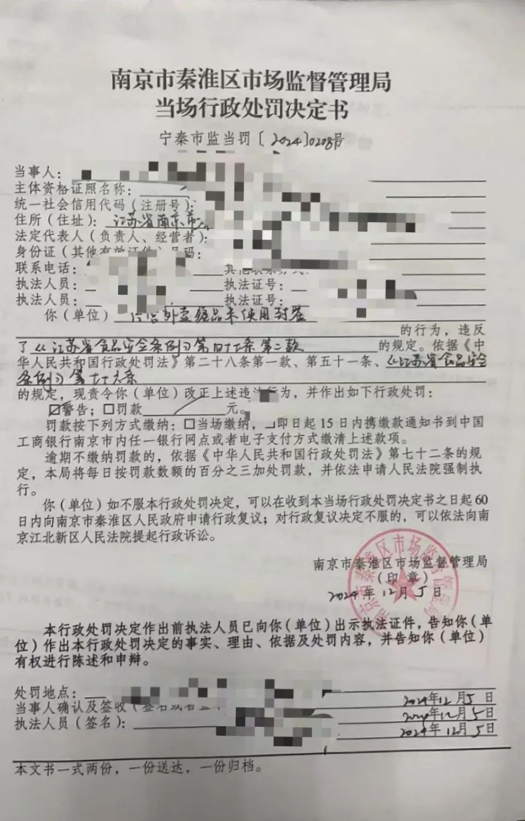 执法人员按照《江苏省食品安全条例》第七十六条的相关规定,下达当场处罚决定书,责令改正并给予警告,同时指导商家严格按照条例要求做好封签使用,防止配送过程产生食品安全风险隐患。