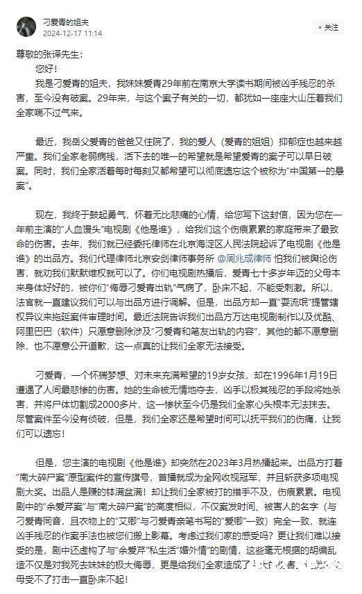 据现代快报,12月17日,“南大碎尸案”被害人刁爱青的姐夫在网上发出一封致演员张译的公开信,称电视剧《他是谁》剧组吃“人血馒头”。刁爱青姐夫称,29年来,与这个案子有关的一切,犹如一座座大山压着他们全家喘不过气来。