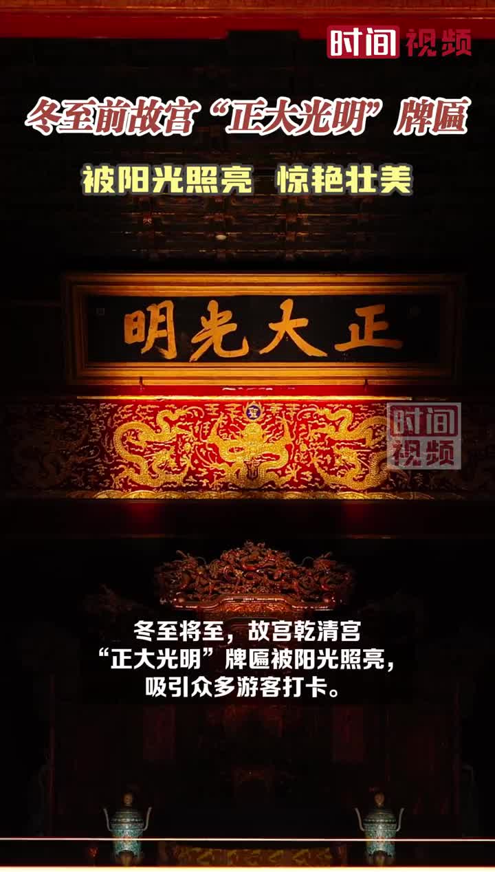 冬至将至,北京故宫乾清宫“正大光明”牌匾被阳光照亮,吸引众多游客打卡。每年冬至前后正午时分,阳光照射到乾清宫地面金砖后,被反射到“正大光明”牌匾上。“正大光明”牌匾和下面五条金龙被依次照亮。 (via 时间视频)