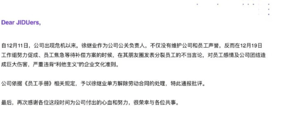 据第一财经,12月20日上午,极越汽车通过邮件发布“员工违纪行为通报”。极越汽车表示,公司出现危机以来,公关负责人徐继业不仅没有维护公司和员工声誉,反而在12月19日工作组努力促成、员工焦急等待补偿方案的时候,在其朋友圈发表分裂员工的不当言论,对员工感情及公司团结造成巨大伤害,严重违背“利他主义”的企业文化准则。公司依据《员工手册》相关规定,予以徐继业单方解除劳动合同的处理,并通报批评。