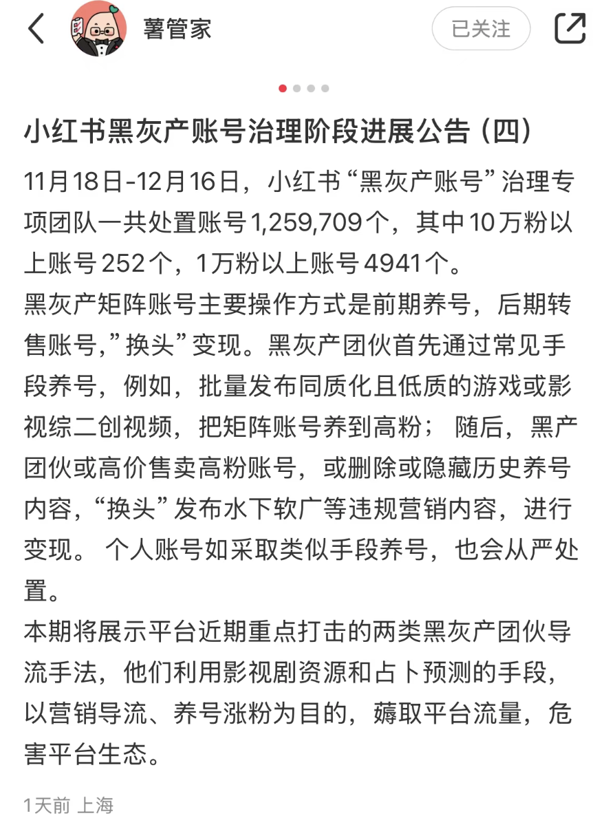 12月19日,小红书公告黑灰产账号治理阶段进展:11月18日-12月16日,小红书“黑灰产账号”治理专项团队一共处置账号1,259,709个,其中10万粉以上账号252个,1万粉以上账号4941个。黑灰产矩阵账号主要操作方式是前期养号,后期转售账号,“换头”变现。个人账号如采取类似手段养号,也会从严处置。
