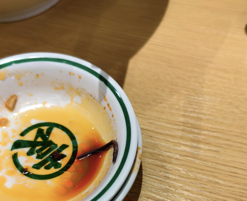焦先生介绍,今年11月19日他在涉事门店花费14元购买了一份鲜肉云吞面。用餐到最后时,他发现面内有一条长约3厘米的紫黑色蚯蚓。向商家反映后,店家仅提出退回14元餐费。