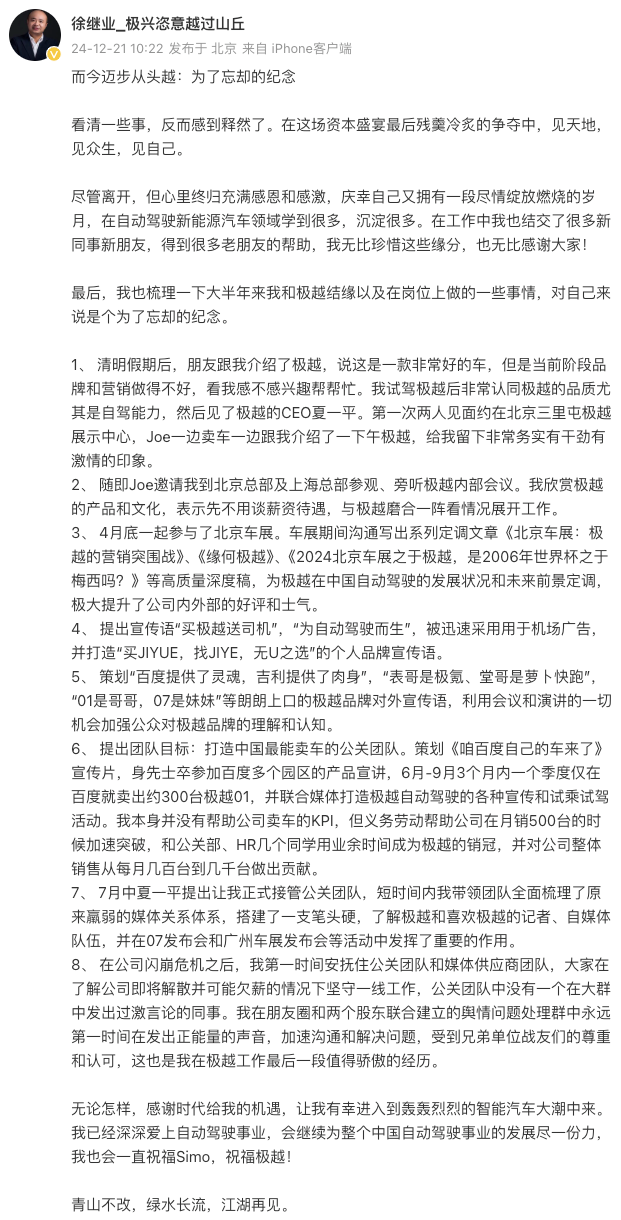 据界面新闻,12月21日,极越汽车公关负责人徐继业在微博发文,确认离开极越。他表示,“在公司闪崩危机之后,我第一时间安抚住公关团队和媒体供应商团队,大家在了解公司即将解散并可能欠薪的情况下坚守一线工作,公关团队中没有一个在大群中发出过激言论的同事。我在朋友圈和两个股东联合建立的舆情问题处理群中永远第一时间在发出正能量的声音,加速沟通和解决问题,受到兄弟单位战友们的尊重和认可,这也是我在极越工作最后一段值得骄傲的经历。”