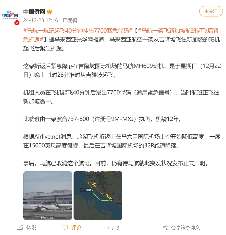 事后,马航已取消这个航班。目前,仍有待马航就此突发状况发布正式声明。