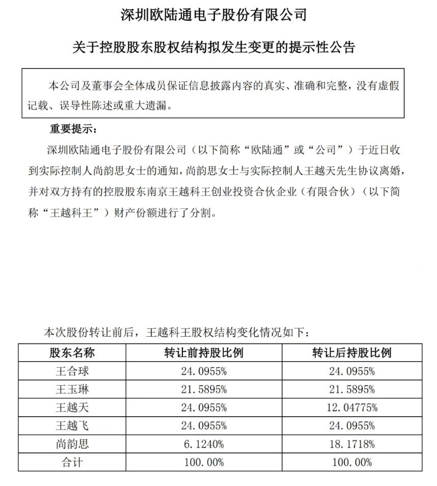 12月23日,欧陆通公告称,公司于近日收到实际控制人尚韵思的通知,尚韵思与实际控制人王越天协议离婚,并对双方持有的控股股东南京王越科王创业投资合伙企业(有限合伙)财产份额进行了分割。王越天拟将其持有的王越科王12.05%的股份转让给尚韵思。上述股权变动尚需办理工商变更登记手续。此次控股股东股权结构调整完成后,公司控股股东及实际控制人均未变更。