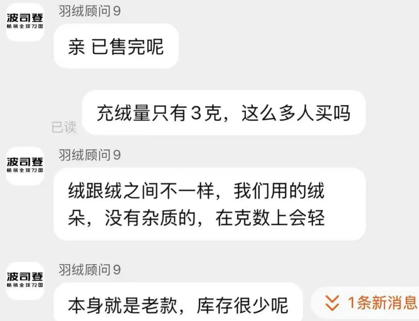 随后,新京报贝壳财经记者以消费者身份向波司登某专卖店客服咨询同款羽绒裤,得到的回应为“已售完”,在追问“为何羽绒裤的充绒量只有3克”时,该店铺客服人员表示:“绒跟绒之间不一样,我们用的绒朵,没有杂质的,在克数上会轻。”
