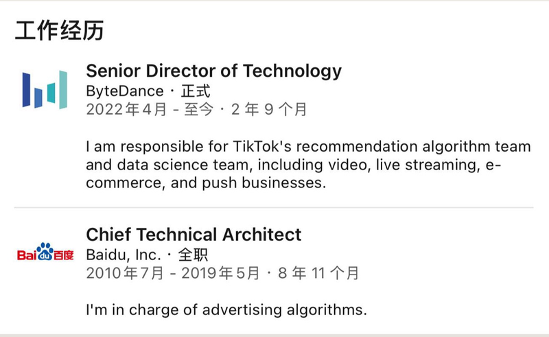 根据陈志杰在领英上的资料,他于2022年4月正式加入字节跳动,职位是技术高级总监,主要负责TikTok的推荐算法团队和数据科学团队。他曾在2020年7月到2019年5月期间在百度工作,期间担任首席技术架构师。