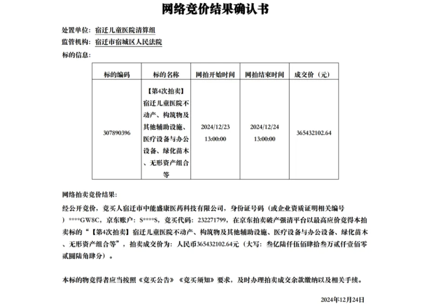 据中国经营报,2024年12月24日下午1点,宿迁儿童医院第四次拍卖结束,当地国资企业宿迁市中能盛康医药科技有限公司以起拍价3.65亿元成功拍得。这比第一次起拍价减少了1.15亿元。