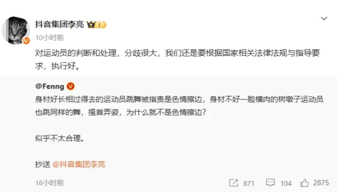 当晚,抖音集团副总裁李亮在微博回应网友称:“对运动员的判断和处理,分歧很大,我们还是要根据国家相关法律法规与指导要求,执行好。”