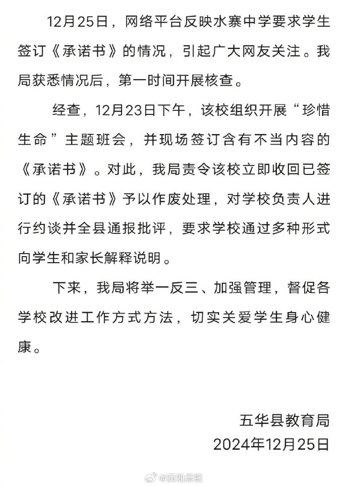 12月25日,网络平台反映水寨中学要求学生签订《承诺书》的情况,引起广大网友关注。我局获悉情况后,第一时间开展核查。
