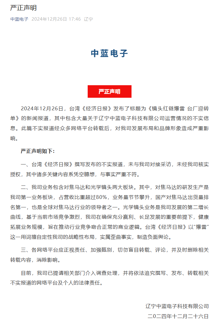 据财联社,中蓝电子发布声明称,相关报道关于公司运营情况的信息不实。声明称,公司业务包含对焦马达和光学镜头两大板块。其中,对焦马达的研发生产是公司第一业务板块,占营收比重超过80%。光学镜头业务是公司发展的第二增长曲线,“基于当前市场竞争激烈,我司在确保充分赢利、长足发展的重要前提下,健康拓展业务规模,旨在推动行业竞争吻合正常的商业逻辑”。
