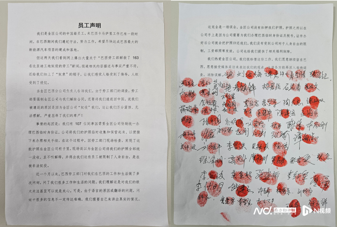 据悉,金匠集团巴西分公司还附有一份手写签名及手印的员工声明。