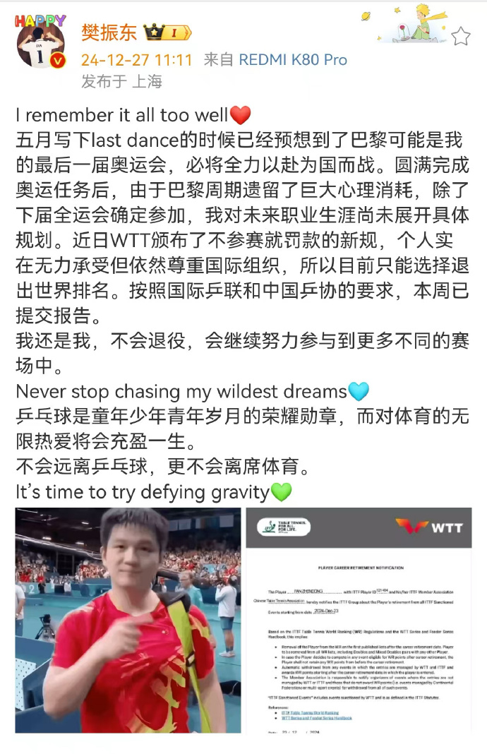 12月27日,樊振东在其个人微博发文宣布退出世界排名。全文如下⬇️